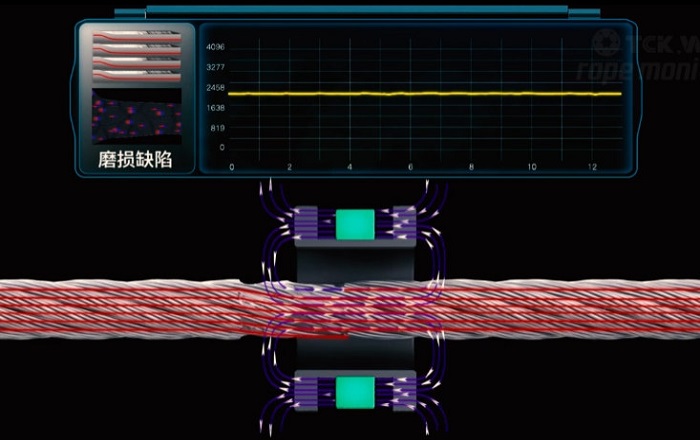 技術特征:寬距、非接觸式檢測;連續(xù)、不間斷采集磁能勢差異信息;對斷絲、磨損、銹蝕、疲勞等損傷進行量化分析。